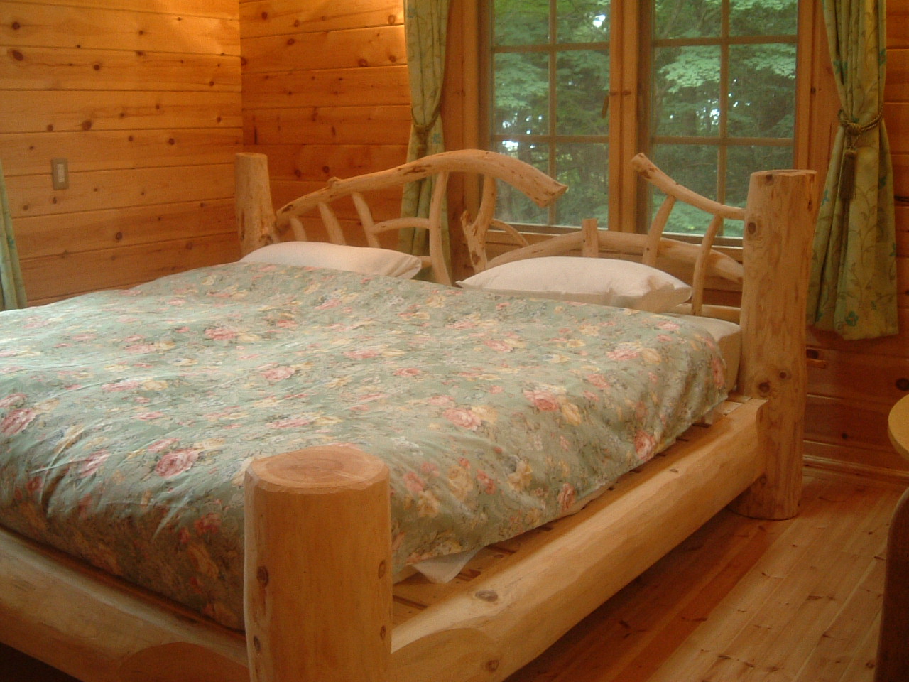 母屋の床にはテラコッタ、階段の親柱には桧の丸太を使い、離れのベッドも桧の丸太と枝を使いハンドメイド!