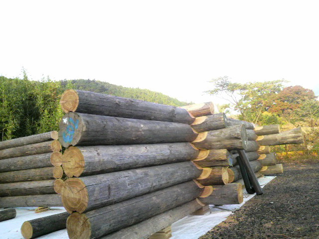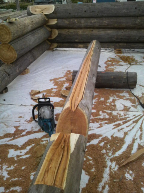 只今6段目!!9段か10段つむので折り返し地点です。このログ材はレッドシダー、表皮をピーリングし、2年くらいカナダに置いていていたので表面がシルバーに変色しています。たいていはもう一度ピーリングをしてきれいに皮むきして積んでいくのですが、今回はこのまま!!素朴なログハウスを目指しています!!一部レッドシダーのきれいな木目を見せるつもりです。