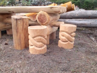 画像↑一番左は丸太をチェンソーで細工した一品。 道具はチェンソーだけで彫って(削って?)いくので、微妙な加減・・・経験を重ねた技かな???