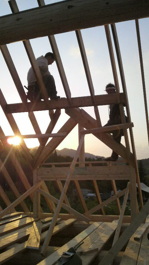 なんとか無事に棟が上がり、とりあえず一枚!さっきまでどしゃ降りだったけど、棟をのせる時にちょうど晴れて気分爽快!!