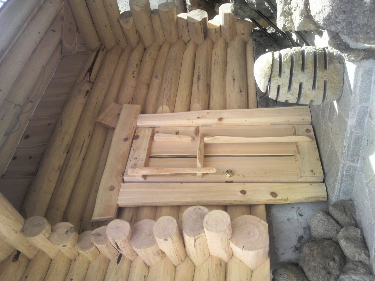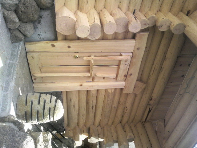 内壁は檜の板をミミつきのまま厚さ45mm、巾300~400に挽いて