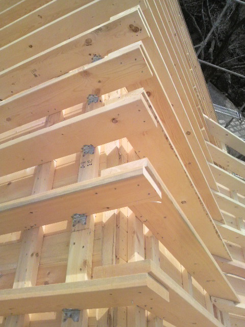 垂木をかけおわり、金物をつけたところです。ちなみに大屋根はカネ勾配、ドーマーは3寸勾配です。